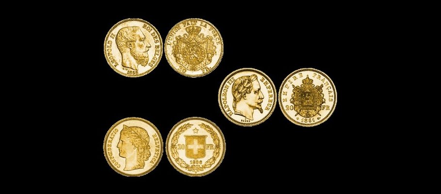 Zlatnik 20 švicarskih frankov Vreneli, zlatnik 20 francoskih frankov Napoleon, zlatnik 20 francoskih frankov Angel, zlatnik 20 francoskih frankov Marianne, zlatnik 20 italijanskih lir Marengo, zlatnik 20 belgijskih frankov Leopold.
